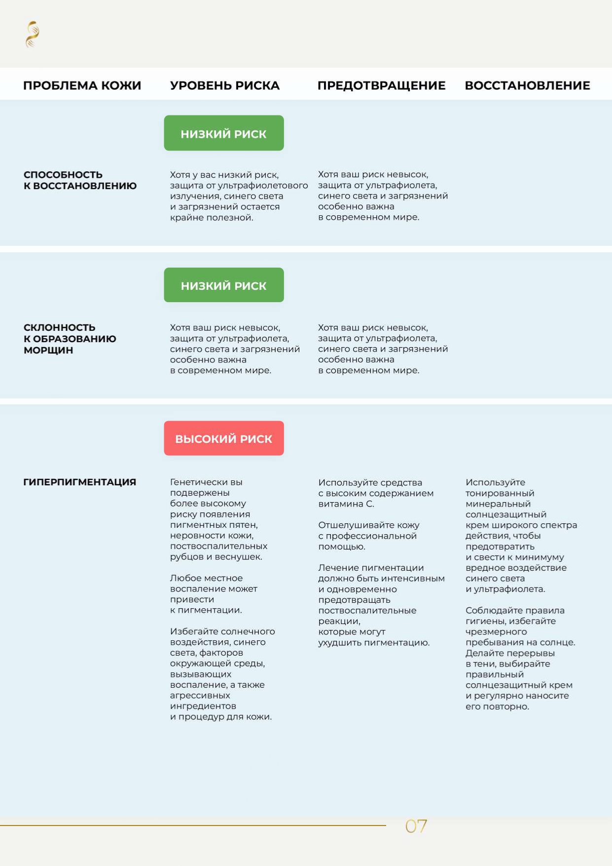 Мы анализируем более 100 генов, чтобы создать персональный генетический паспорт красоты и помочь вам подобрать идеальный уход на основе вашей ДНК. Анализ семи ключевых аспектов здоровья кожи показывает: